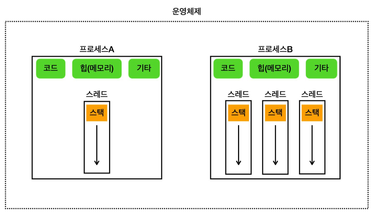 - 한 프로세스 내에서 여러 스레드 존재 가능